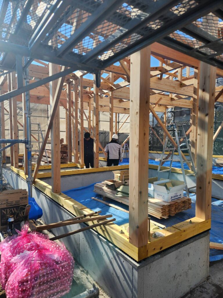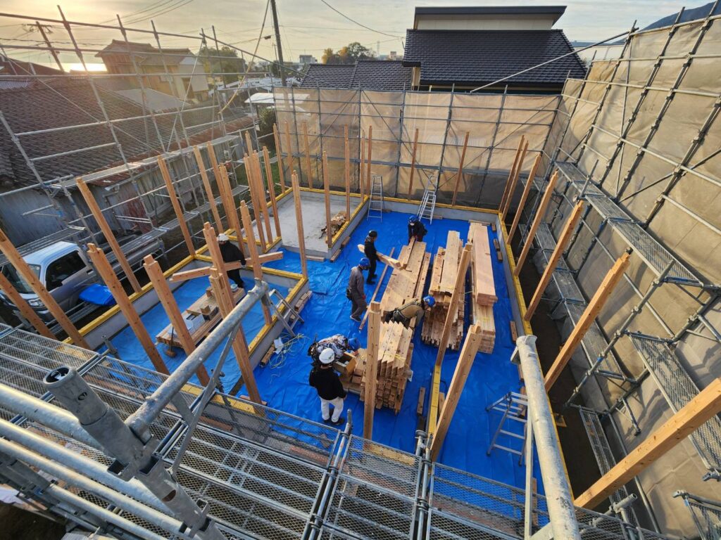 現場では安全確認を徹底し、職人同士が声を掛け合いながら、無事に棟上げを完了することができました。